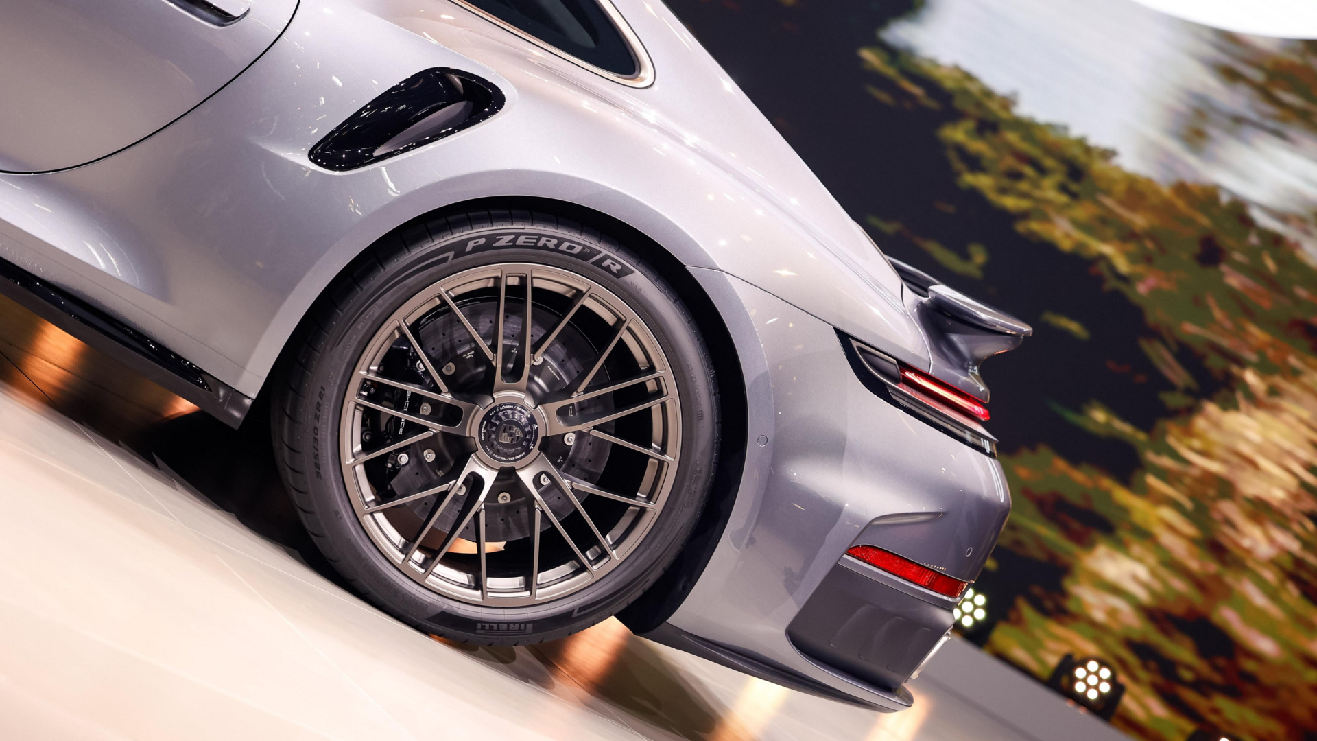 An dieses beeindruckende Leistungsvermögen des 911-Spitzenmodells passten die Porsche-Ingenieure die komplette Peripherie des Fahrzeugs an. Die neue Reifengeneration, die beim 911 Turbo S zum Einsatz kommt, bietet ein deutlich verbessertes Trockenhandling bei unverändert guten Nässeeigenschaften. An der Hinterachse des Sportwagens kommen nun zehn Millimeter breitere Reifen der Dimension 325/30 ZR 21 zum Einsatz. An der Vorderachse sind wie beim Vorgänger Reifen der Dimension 255/35 ZR 20 montiert. Die serienmäßige Keramik-Verbundbremsanlage PCCB erhielt neue Bremsbeläge. Dies verbessert Bremsleistung und Pedalgefühl gleichermaßen. Die Ingenieure erhöhten den Bremsscheibendurchmesser an der Hinterachse von 390 mm auf 410 mm. Vorne kommen Bremsscheiben mit einem Durchmesser von 420 mm zu Einsatz. Damit ist der neue 911 Turbo S mit der größten PCCB-Bremsanlage ausgestattet, die Porsche in einem Zweitürer je verbaut hat.