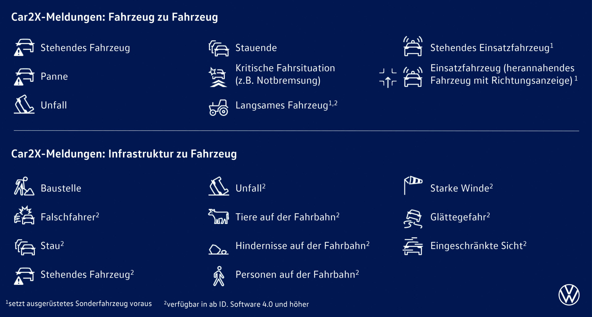 Die Car2X-Technologie in Kürze. Die Car2X-Direktkommunikation basiert in den Modellen von Volkswagen auf dem Funkstandard WLANp. Mithilfe dieser Technologie können Fahrzeuge Warnungen, Positionsdaten und weitere Informationen in einem Umkreis von bis zu 800 m in Echtzeit miteinander austauschen. Der Nachrichtenaustausch ist offen und standardisiert und ermöglicht so eine herstellerübergreifende Kommunikation. Zum Schutz der Privatsphäre werden die Nachrichten anonymisiert. Der Hauptnutzer muss Car2X im Infotainmentsystem zudem aktivieren. Die Übertragung der Informationen ist kostenfrei, da diese nicht über das Mobilfunknetz erfolgt. Das Assistenzsystem „Gefahrenwarnung“ mit der Car2X-Technologie ist aktuell in den Modellen Golf, T-Roc, Tiguan, Tayron, Passat, ID.3, ID.4, ID.5 als Option und im ID.7 serienmäßig verfügbar.
