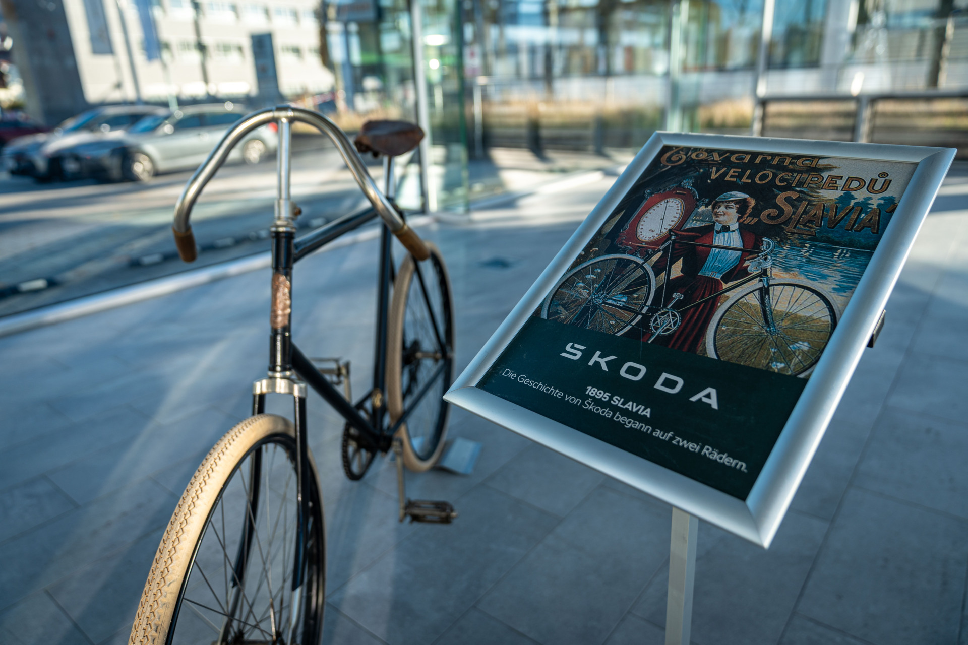 Škoda Auto feiert in diesem Jahr sein 130-jähriges Jubiläum und blickt auf eine Reise zurück, die mit dem ersten Fahrrad „made in Mladá Boleslav“ von Laurin und Klement begann und zu einem international erfolgreichen Automobilhersteller führte. Dieses Fahrrad mit dem Namen „Slavia“ ist im Rahmen der Škoda-Sonderschau im Konzernschaufenster der Porsche Holding ebenso zu sehen wie das erste Auto der beiden Gründer Václav Laurin und Václav Klement: die Voiturette A.