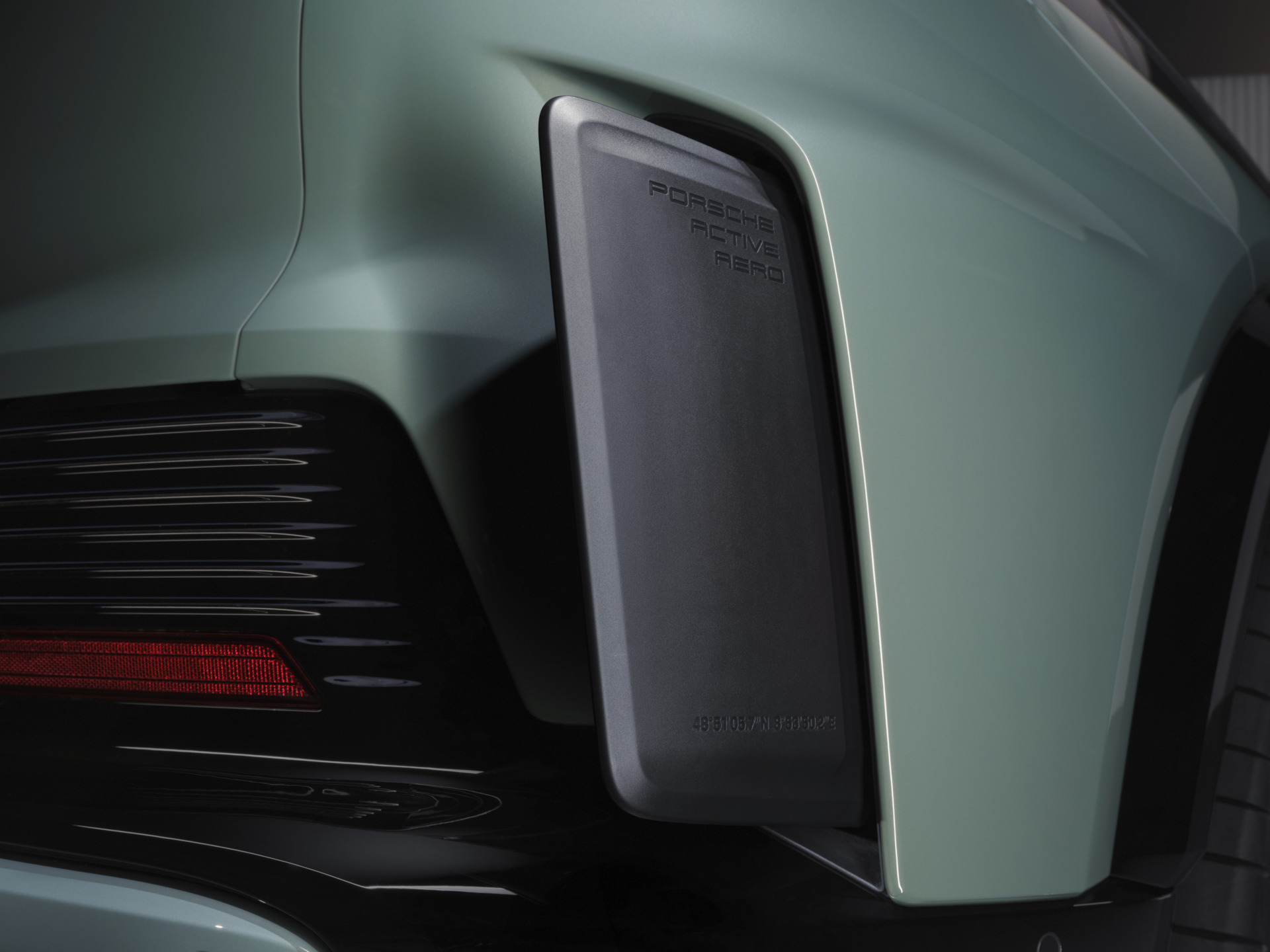 Mit einem cw-Wert von 0,25 gehört der neue Cayenne Electric zu den strömungsgünstigsten SUVs seiner Klasse mit entsprechenden Vorteilen bei Reichweite und Verbrauch. Porsche Active Aerodynamics (PAA) passt die aerodynamischen Eigenschaften präzise auf die jeweilige Fahrsituation und Geschwindigkeit an und bietet neben einer effizienten Regelstrategie durch aerodynamischen Abtrieb auch einen Beitrag zur markentypischen Fahrdynamik. Zu den aktiven Aerodynamik-Elementen zählen im Bugteil bewegliche Kühlluftklappen, der adaptive Dachspoiler sowie zusätzlich am Heckteil des Turbo die innovativen, aktiven Aeroblades. Sie verlängern die seitlichen Abrisskanten und verbessern die Strömungseigenschaften, was zu einem Reichweitenplus insbesondere bei höheren Geschwindigkeiten führt. Weitere aerodynamische Maßnahmen sind Air Curtains im Bugteil, der nahezu vollständig geschlossene Unterboden, spezielle Aero-Räder sowie ein Diffusor im Heck.