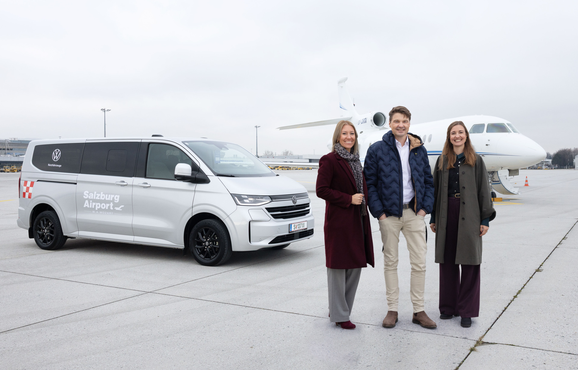 Am Vorfeld des Salzburg Airport W. A. Mozart erfolgte kürzlich die offizielle Übergabe eines Volkswagen e-Caravelle durch Porsche Austria Geschäftsführer Wilfried Weitgasser und Volkswagen Nutzfahrzeuge Markenleiterin Miriam Walz an Isabella Laimer, Sales- & Marketingleiterin des Flughafen Salzburg.