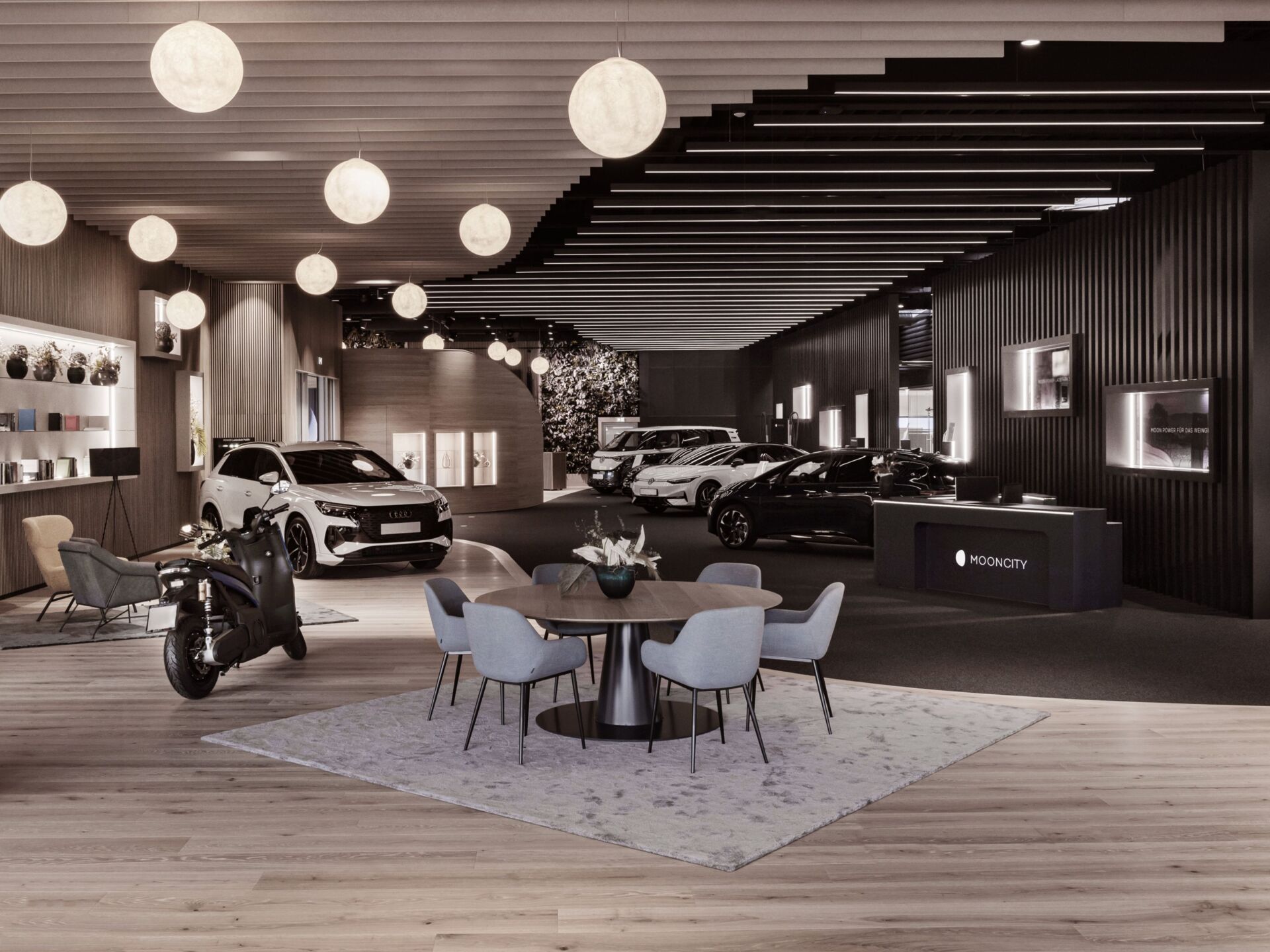 Das Interieurkonzept der MOONCITY 2.0 holt die helle und die dunkle Seite des Mondes unter ein Dach und bietet auf rund 700 m² Fläche zwei Bereiche: Die „helle Seite“ dient als einladender Loungebereich – etwa zum Entspannen, Kaffee-Trinken oder Neuheiten des umfangreichen MOON POWER-Sortiments studieren, während der eigene Stromer sich mit neuer Energie versorgt. Die abgedunkelte Seite wiederum eignet sich hervorragend für Präsentationen, Seminare und Veranstaltungen aller Art.