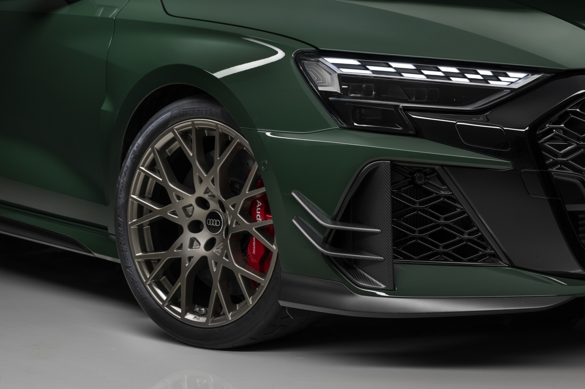 Er setzt auf ein expressives Design mit matten Carbon-Elementen: Dazu gehören je Seite zwei neue Flics, die seitlich der Front übereinander angeordnet sind und passend zu den vertikalen Blades der Air Curtains aus Carbon bestehen. Sie lassen das Sondermodell breiter wirken, ebenso wie die geteilte Spoilerlippe unterhalb der großen Lufteinlässe. Damit duckt sich der RS 3 competition limited* tief und steht satter auf der Straße.