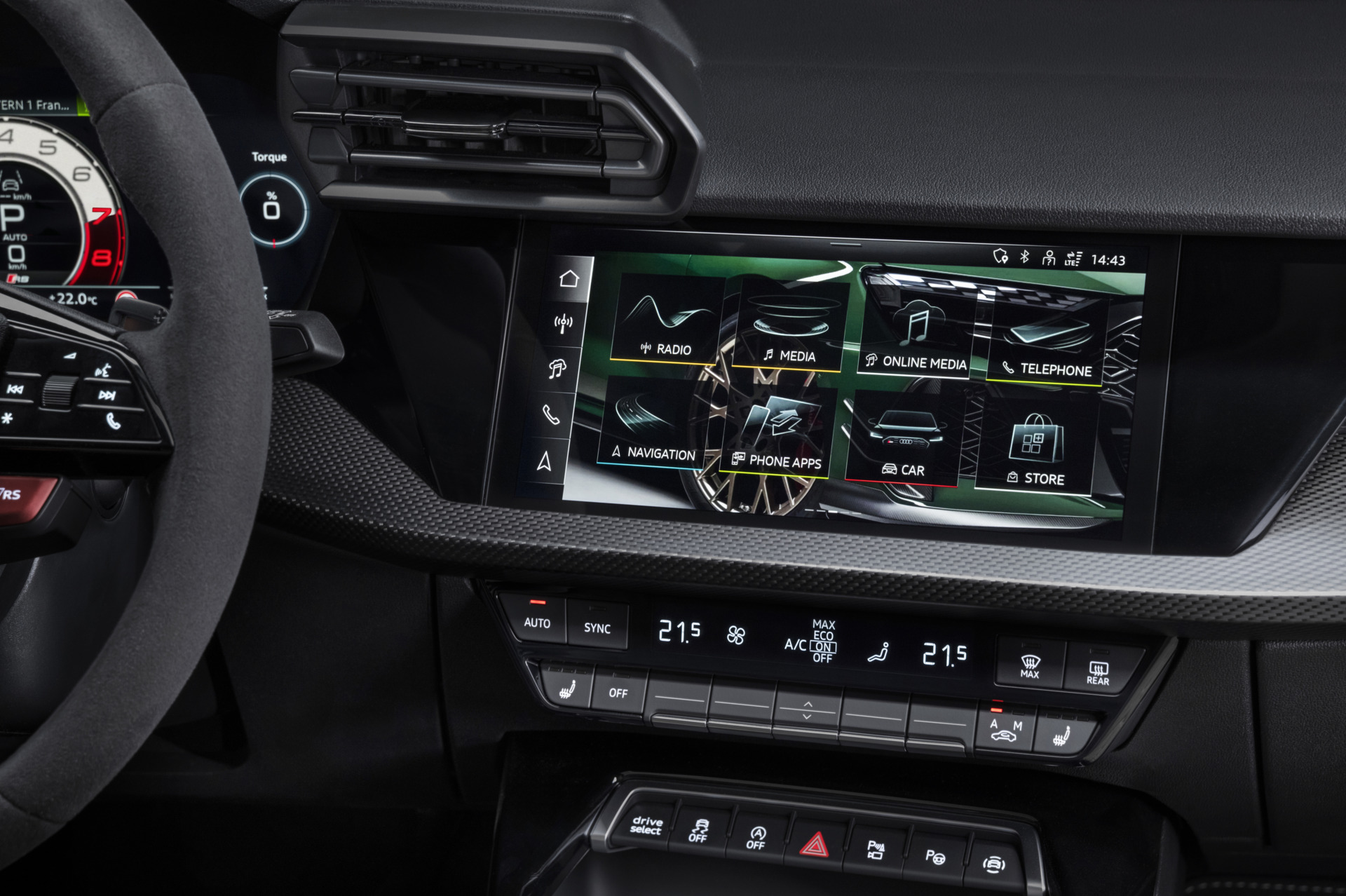Wer vorn links sitzt, hat alles bestens im Griff und Blick. Auf dem 10,1 Zoll Touch-Display in der Instrumententafel lassen sich RS-spezifisch performance-relevante Parameter abfragen: Die Temperaturbereiche von Kühlmittel, Torque Splitter, Bremse sowie Motor- und Getriebeöl werden farbig illustriert sowie Reifendruck und -temperatur angezeigt. Zur schnellen Positionierung der Mittellage und zur Visualisierung kleinster Lenkeinschläge trägt das sportlich oben und unten abgeflachte Lenkrad eine 12-Uhr-Markierung – optisch akzentuiert in Ingwerweiß. Passend dazu zieren identisch farbige Kontrastnähte den Lenkradkranz aus schwarzem Dinamica. Dahinter zeigt das Audi virtual cockpit plus ein exklusives Design: