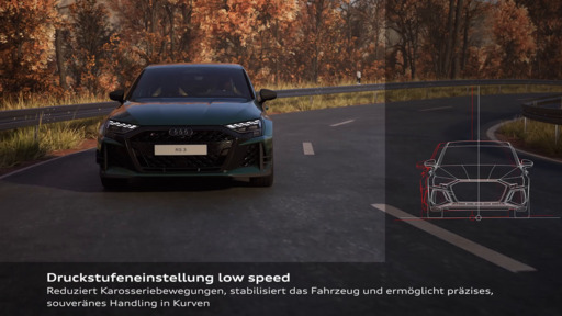Die Druckstufe high speed kompensiert Aufbaubewegungen der Karosserie, wenn abrupt hohe Kräfte auf das Fahrwerk treffen. Dies kann beim Überfahren von Bodenwellen oder schnellen Lenkbewegungen der Fall sein. Die Einstellung der Dämpfung erfolgt in 15 Intensitäten. Durch eine straffere Dämpfercharakteristik (Drehregler nach „+“) werden hochfrequente Vertikalanregungen stärker gedämpft und somit die Rückmeldung von der Fahrbahn intensiviert. Mit sinkender Dämpfkraft (Drehregler nach „-“) erhöht sich der Abrollkomfort und der RS 3 competition limited* meistert Unebenheiten sanfter.