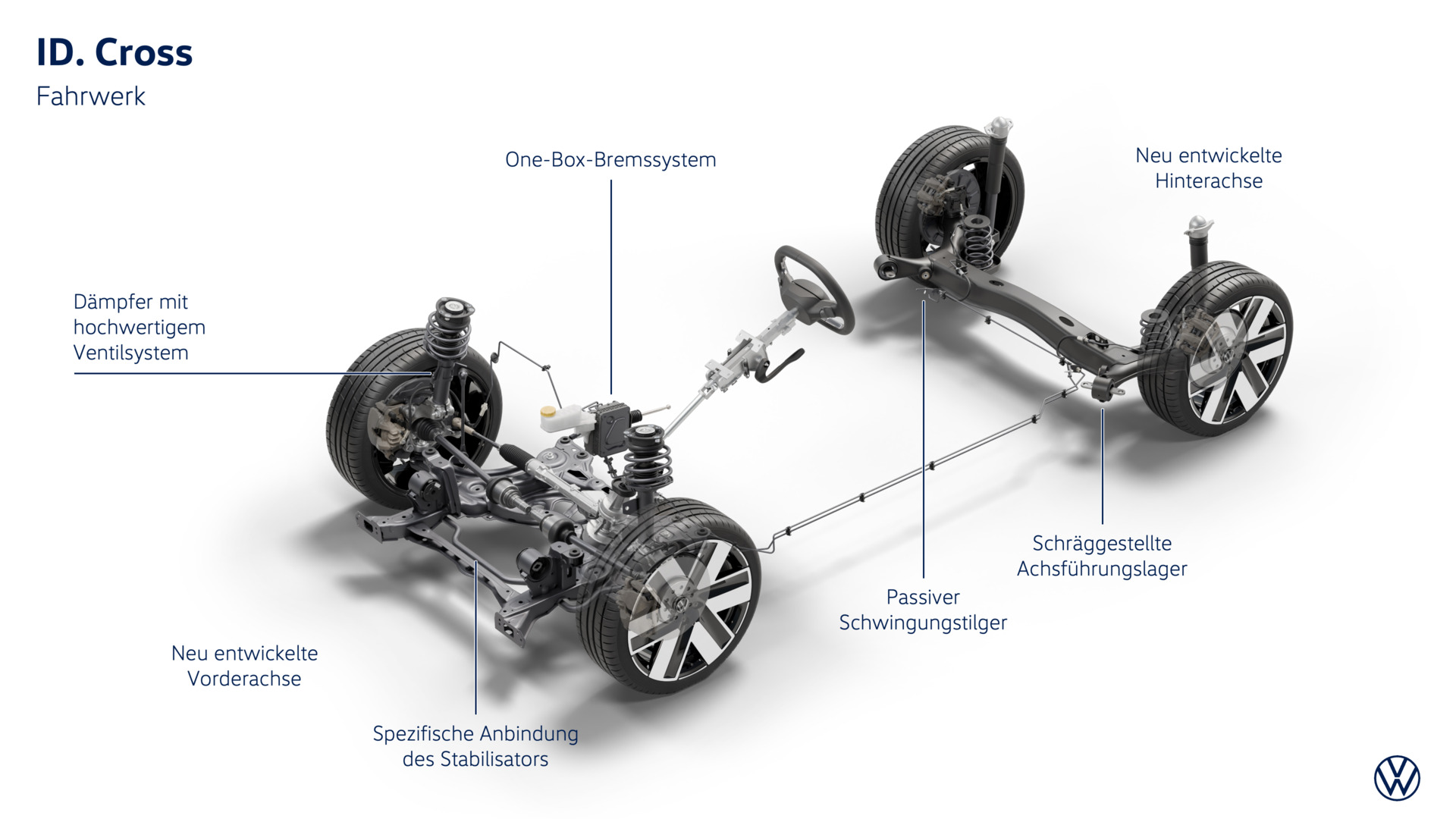 Neue Achsarchitektur. Auf den neuen Frontantrieb des elektrischen SUV zugeschnitten wurde das ebenfalls neue Fahrwerk. Ziel war es auch hier, bei einer hohen Kosten-, Raum- und Gewichtseffizienz eine optimale und für Volkswagen typische Lösung zu konzipieren. Vor diesem Hintergrund entstand ein Verbund aus einer MacPherson-Vorderachse und einer besonders kompakt bauenden Verbundlenker-Hinterachse. Das Zusammenspiel dieser beiden neuen Achsen ist geprägt durch ein Höchstmaß an präziser Linearität – ein Fahrverhalten, das dem Fahrer ein maximales Feedback vermittelt und so für spürbar mehr Sicherheit sorgt. Darüber hinaus kennzeichnet den neuen ID. Cross ein besonders guter Fahrkomfort. Durch ein neues, sogenanntes One-Box-Bremssystem mit Scheibenbremsen an der Vorder- und Hinterachse wurde zudem die Dosierbarkeit der Bremsen und das Pedalgefühl im Vergleich zu anderen Elektroautos perfektioniert. Das neue Bremssystem ist zudem besonders leicht und bietet eine sehr effiziente Rekuperationsleistung.