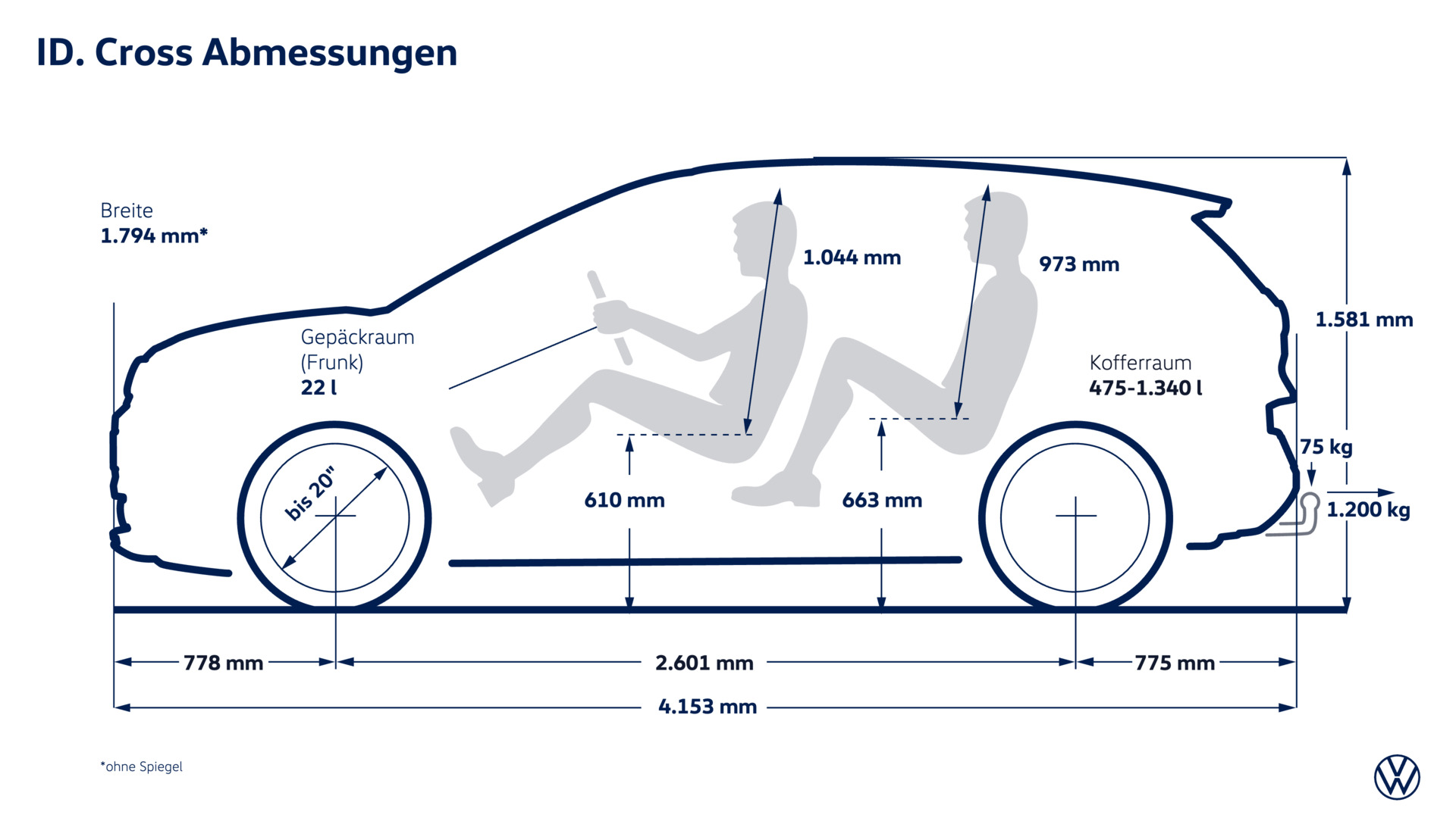 Optimale Raumökonomie. Der neue ID. Cross ist 4.153 mm lang, 1.581 mm hoch und 1.794 mm breit. Zwischen den 17 bis 20 Zoll großen Rädern spannt sich ein Radstand von 2.601 mm. Damit ist der auf dem MEB+ (neuste Evolutionsstufe des Modularen E-Antriebsbaukastens) basierende ID. Cross ein wenig größer als sein Pendant aus der Verbrennerwelt: der T-Cross (Basis MQB). Gleichwohl bietet der neue ID. Cross noch mehr Raum für die fünf Passagiere und deren Gepäck. Zum einen sind es die 38 mm mehr Radstand, zum anderen die konzeptionell bedingten Raumvorteile des MEB+ gegenüber dem MQB, durch die der Fahrer und seine bis zu vier Mitreisenden in den Genuss von zusätzlichen Zentimetern in der Länge, Höhe und Breite des Innenraumes kommen. Signifikant sind die Zuwächse im Kofferraum: Mit 475 Litern bietet der ID. Cross 20 Liter mehr Stauraum als der T-Cross. Zudem gibt es im elektrischen SUV einen zusätzlichen kleinen Gepäckraum (Frunk) unter der Fronthaube, der weitere 22 Liter aufnimmt – ein idealer Platz für das Ladekabel und kleinere Utensilien.