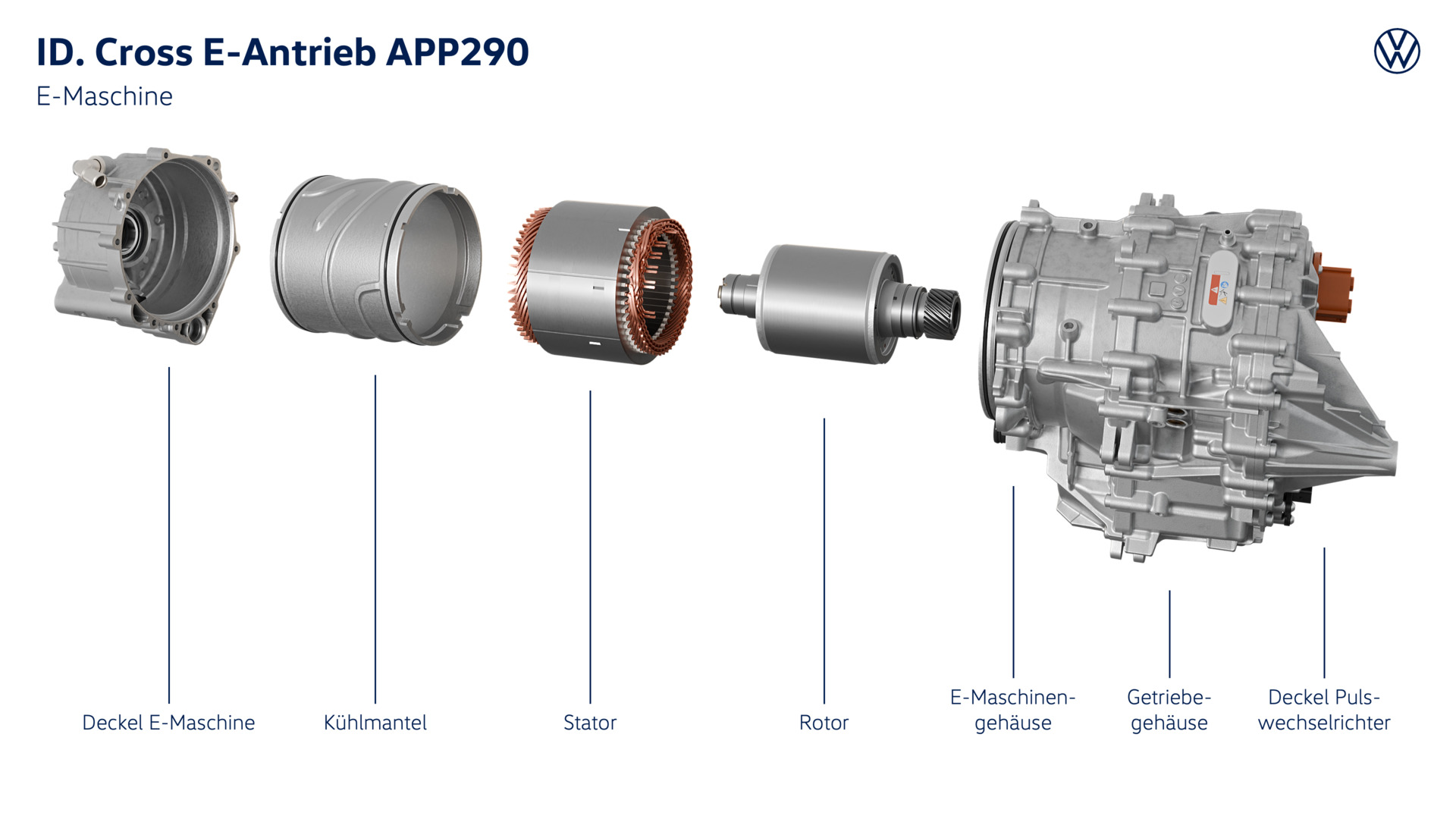 MEB+ mit Frontantrieb. Im ID. Cross kommt die neuste Evolutionsstufe des Modularen E-Antriebsbaukasten zum Einsatz: der MEB+. Erstmals seit dem e-up! und e-Golf kombiniert Volkswagen den E-Antrieb dabei wieder mit der allein angetriebenen Vorderachse. Die größeren ID. Modelle setzen indes auf Heck- oder Allradantrieb. Das dynamische Herz des Systems im ID. Cross ist die neue E-Maschine des Antriebssystems APP290. APP ist die Abkürzung für Axial Parallel Position – die achsparallele Anordnung; die 290 spiegelt das maximale Drehmoment in Newtonmetern wider. Die neue E-Maschine wird es im ID. Cross zunächst in drei Leistungsstufen geben: