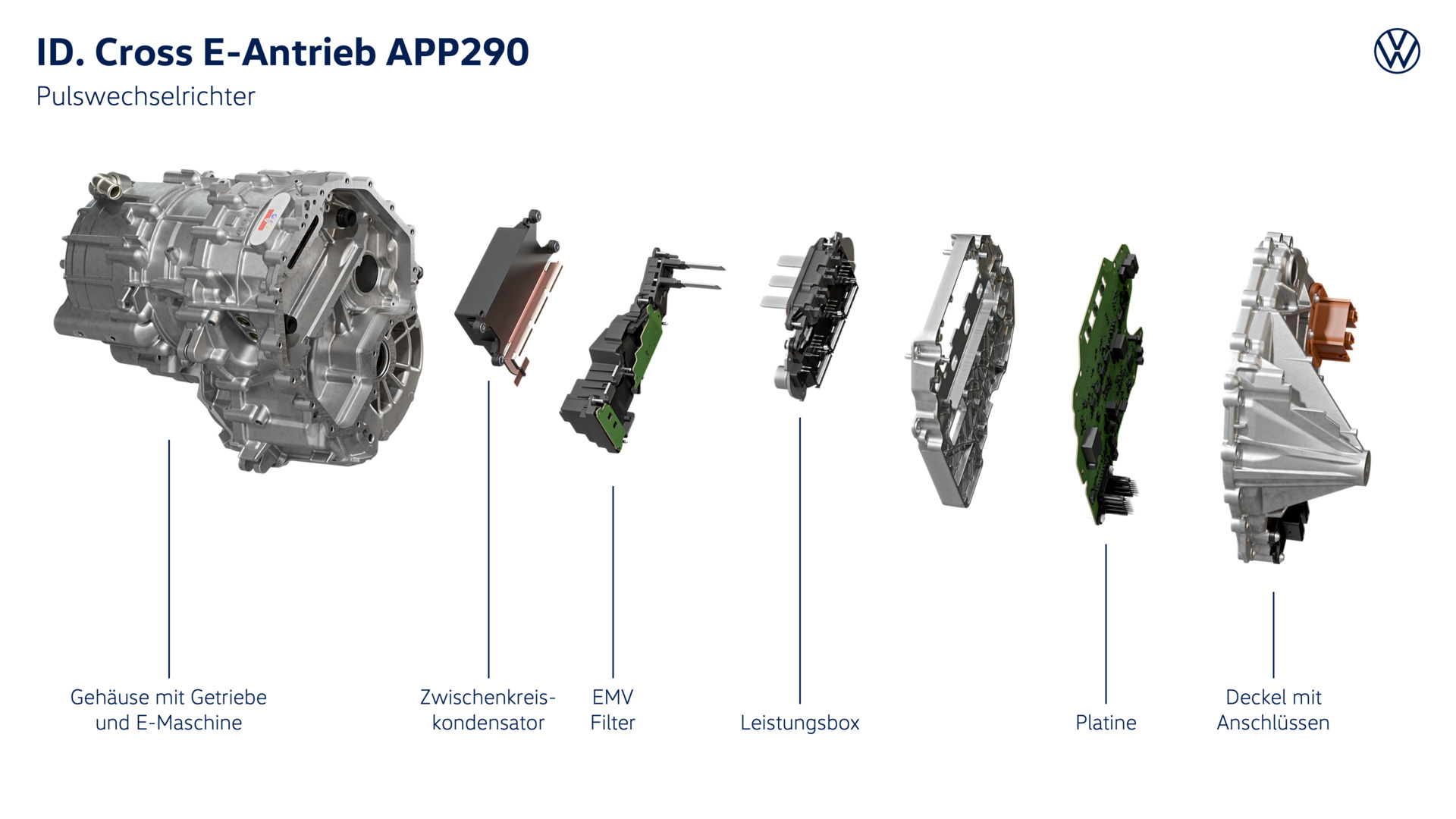 Neuer Pulswechselrichter. An das Motorgehäuse angeflanscht ist ein 1-Gang-Getriebe samt Gehäuse und der ebenfalls neu entwickelte Pulswechselrichter. Er koordiniert die Leistungs- und Drehmomententwicklung sowie die Rekuperation des Antriebs. Zudem wandelt diese Leistungselektronik den Gleichstrom der Batterie (DC) in den von der E-Maschine benötigten Wechselstrom (AC) um. Der neue Pulswechselrichter ist eine eigenständige Volkswagen Entwicklung, die dank der verwendeten Hightech-Komponenten und hochwertigen Materialien die Effizienz erhöht und damit den Verbrauch des SUV senkt. Da das Bauteil intern entwickelt wurde und gebaut wird, entsteht zudem ein Kostenvorteil, der sich direkt auf den attraktiven Einstiegspreis des ID. Cross auswirkt. Zu den weiteren Komponenten des kompakt im Vorderwagen integrierten Antriebs gehören unter anderem die AC- und DC-Ladebuchse vorn auf der rechten Seite, das dort in der Nähe integrierte Ladegerät und der elektrische Klimakompressor. Er wurde aufwendig von der Karosserie entkoppelt und überträgt somit keine Vibrationen in den Innenraum.