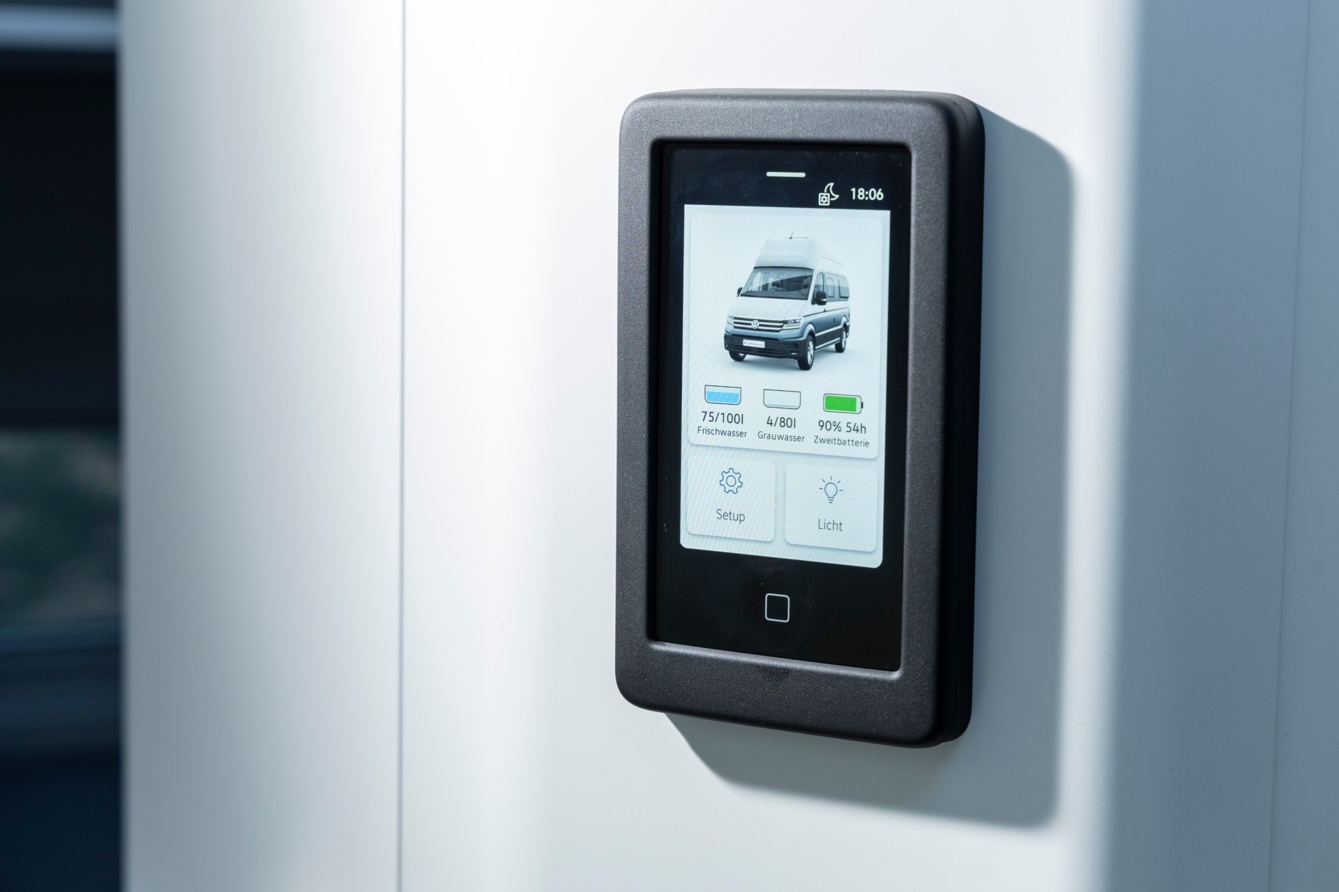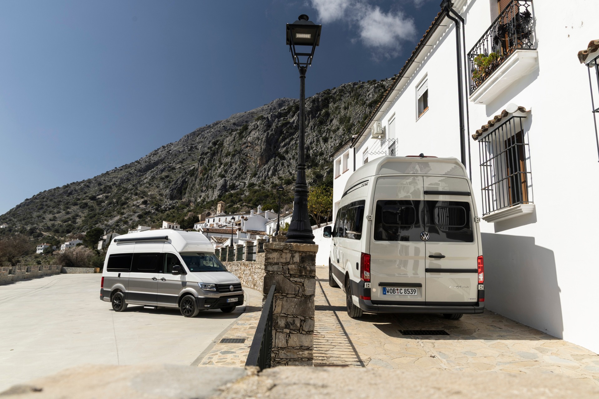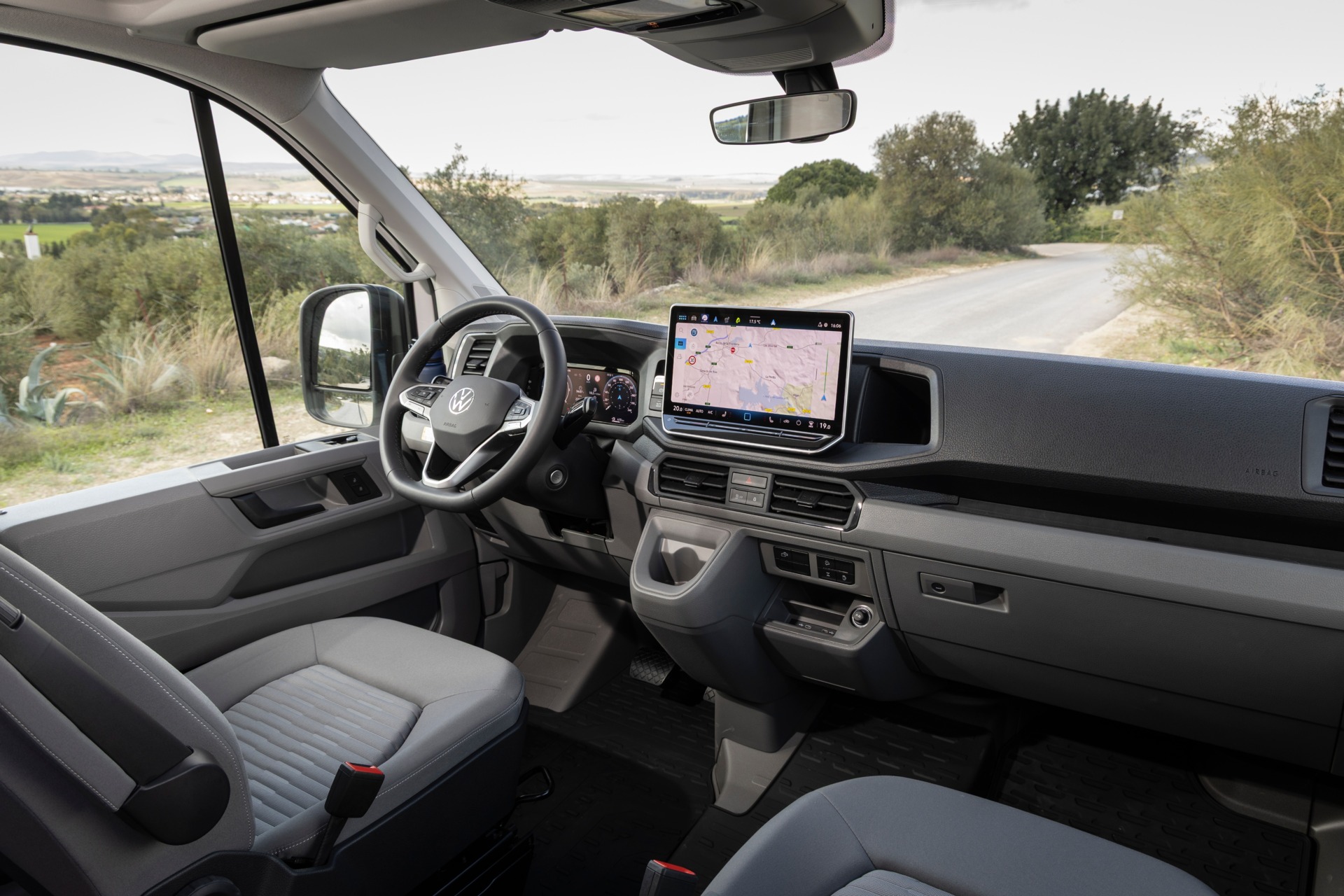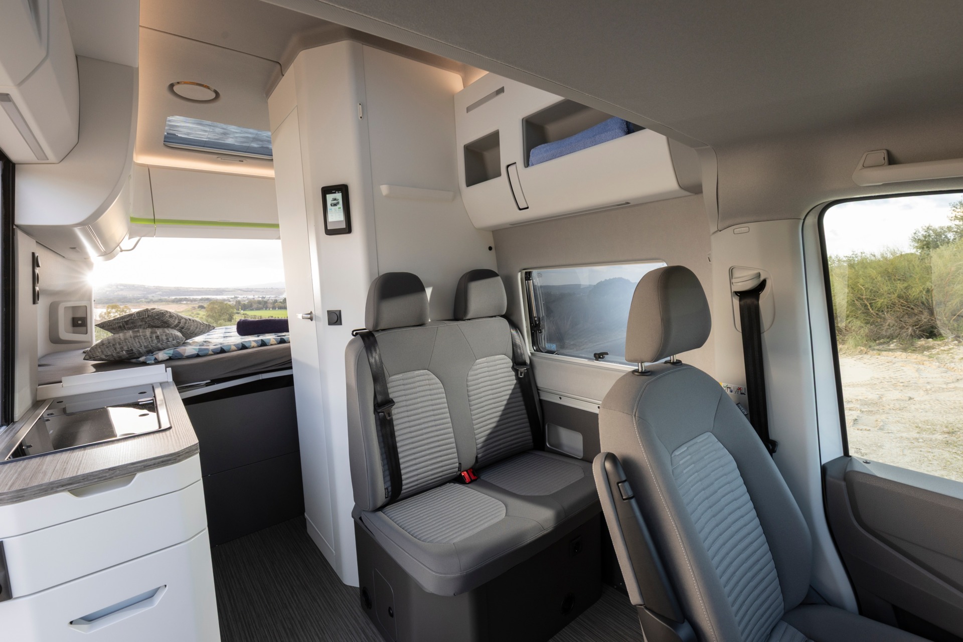 Alle Grand California Modelle profitieren von der technischen Weiterentwicklung des Crafter: Digital Cockpit Pro, neu gestaltetes Infotainmentsystem mit großem Touchscreen, Assistenzsysteme wie Front Assist, Lane Assist, Parkhilfen und Verkehrszeichenerkennung gehören bereits zur Serienausstattung. Auf Wunsch kommt der Travel Assist hinzu, der eine assistierte Längs und Querführung ermöglicht. Die neue elektronische Parkbremse schafft zudem mehr Bewegungsfreiheit im Cockpit – besonders praktisch beim Drehen des Fahrersitzes in den Wohnraum.