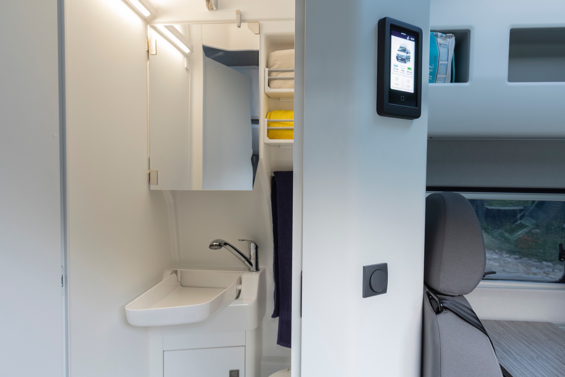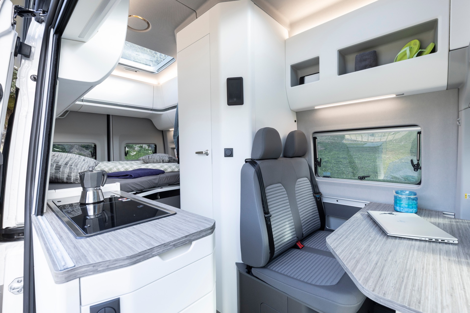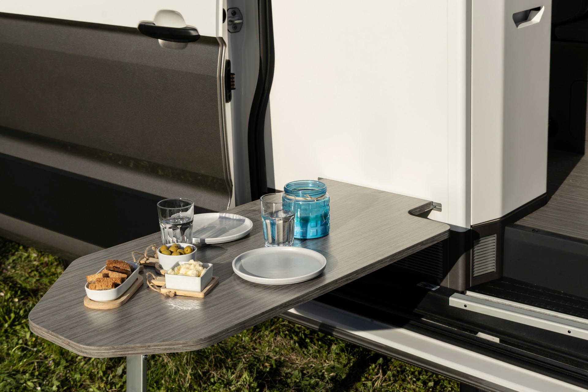 Im Mittelpunkt der Modellpflege steht das neue Interieur Design. Tischplatte, Arbeitsflächen und Bodenbelag erscheinen im neuen Dekor „Atami Bambus“, das dem Wohnbereich eine freundliche, mediterrane und gleichzeitig moderne Note verleiht. Ergänzend dazu wurde der Wasserhahn in der Küche neu in Schwarz gestaltet, ebenso Griffe, Schalter und Steckdosen. Durch neue Gepäcknetze in den Oberschränken entsteht zusätzlicher, einfach zugänglicher Stauraum. Der Esstisch kann nun sowohl innen genutzt als auch außen am Küchenblock arretiert werden – ideal für Mahlzeiten unter freiem Himmel. Optional ergänzt ein neues passgenaues Thermomatten- und Verdunkelungsset die Ausstattung.