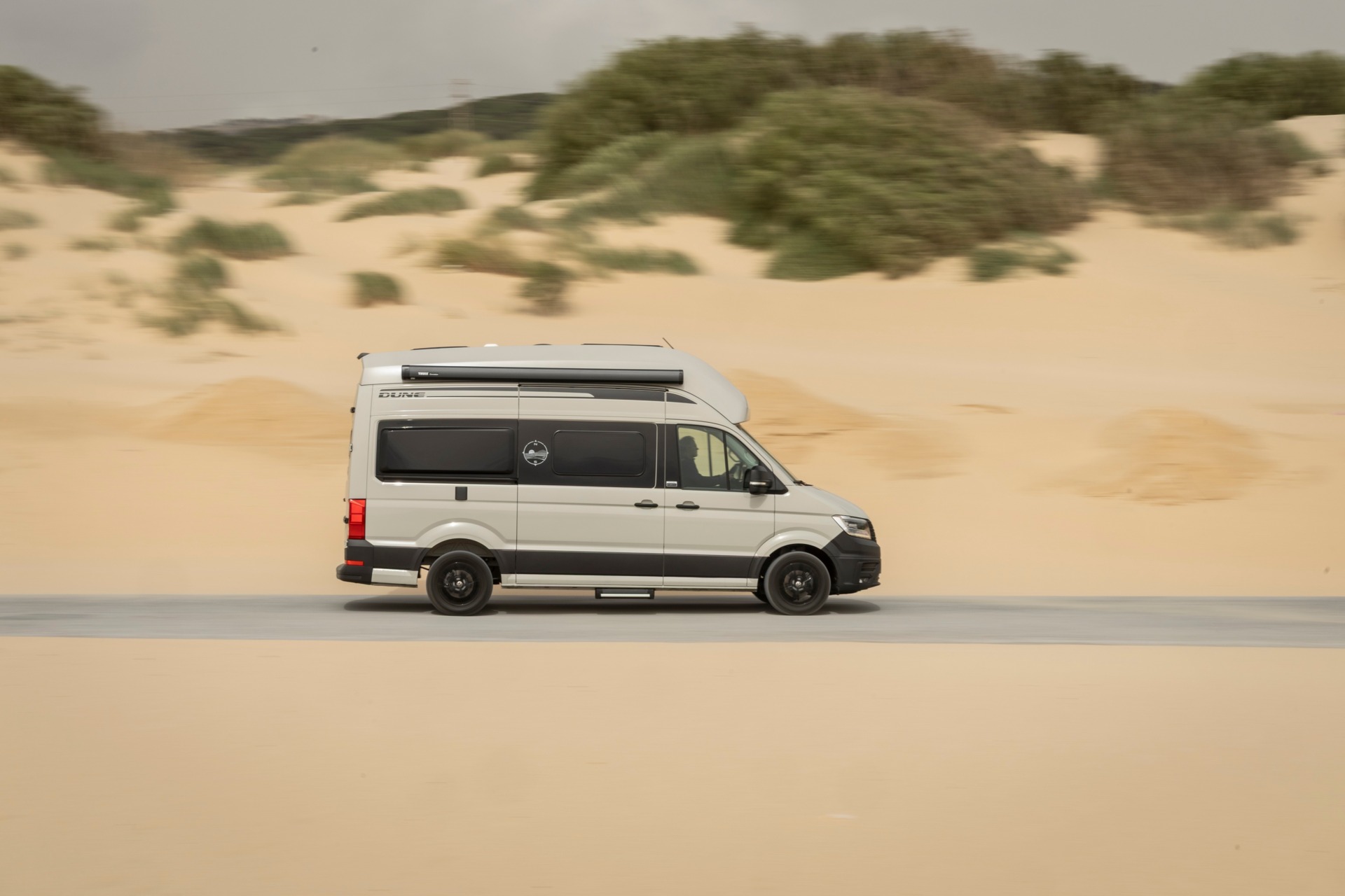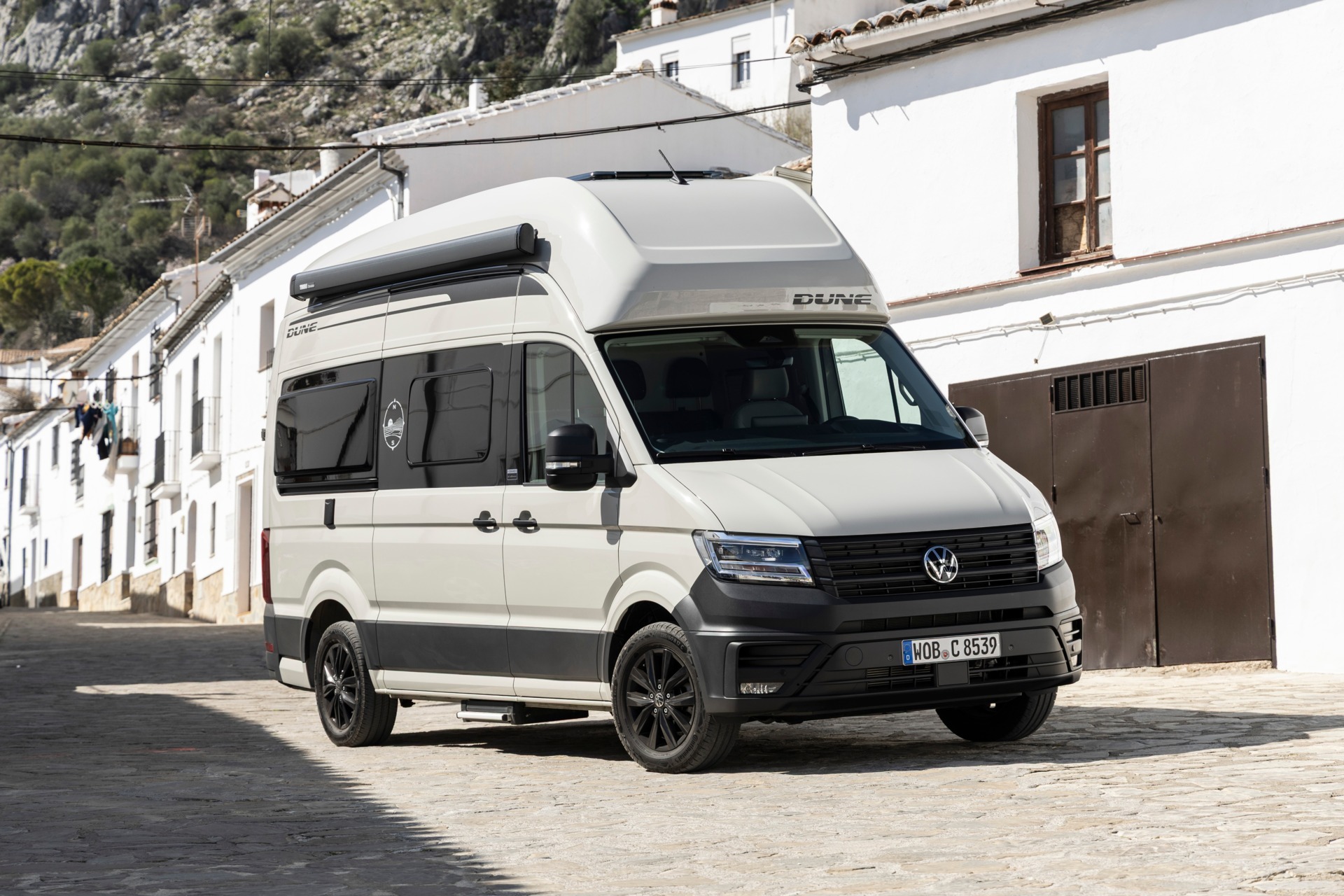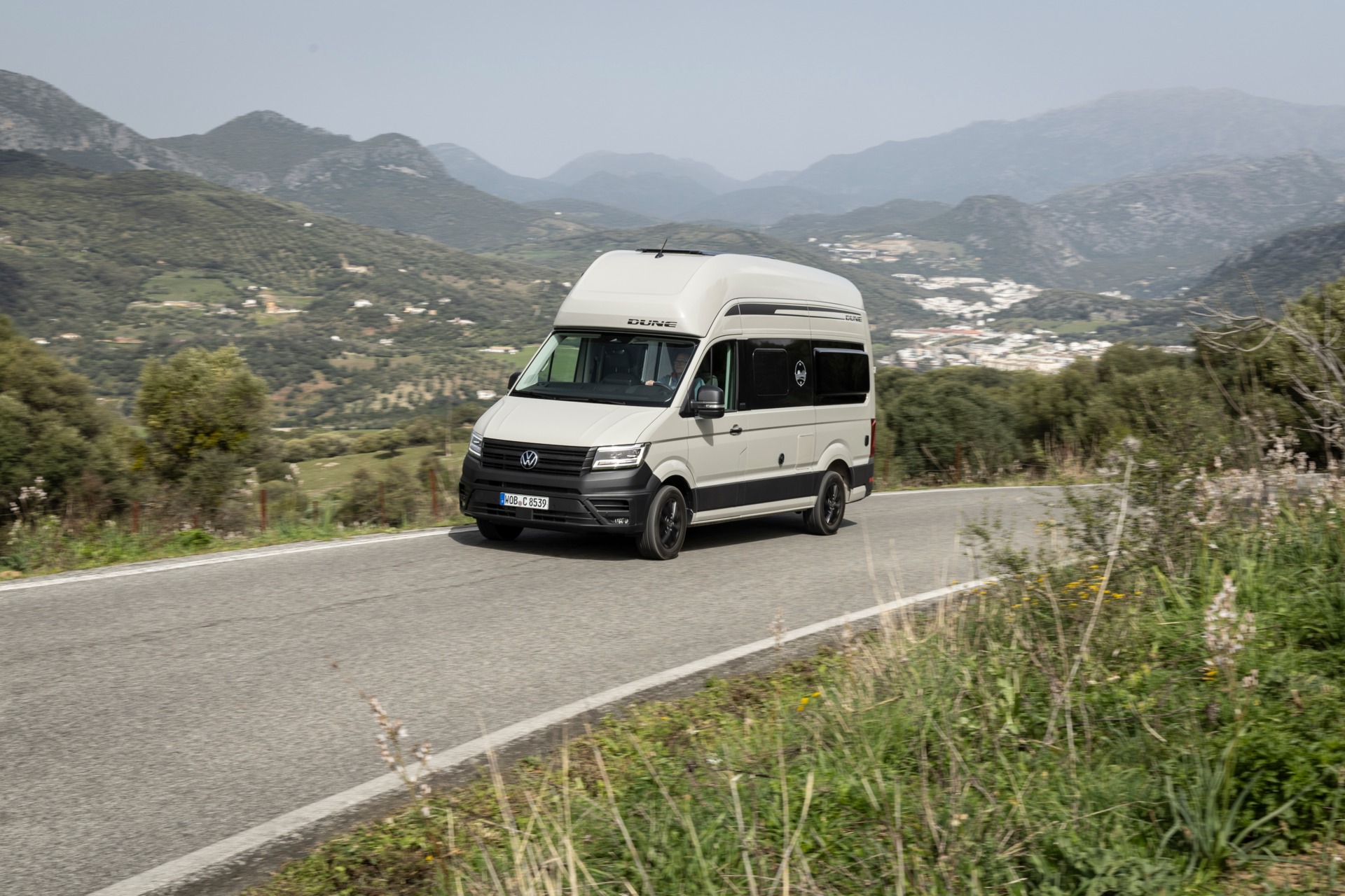 Mit dem Grand California Dune ergänzt Volkswagen Nutzfahrzeuge die Baureihe um ein besonders exklusives Sondermodell. Charakteristisch ist die exklusive Lackierung in „Ascotgrau“, ein heller Ton inspiriert von Dünenlandschaften. Schwarze DUNE-Schriftzüge am Dach und der Front sowie ein integrierter Kompass Akzent in der Fensterlinie unterstreichen den Abenteuer-Look. Robuste Kunststoffbeplankungen und schwarze 17 Zoll Leichtmetallräder „Lismore“ runden das Exterieur ab. Technisch setzt das Modell auf ein erweitertes Assistenzpaket inklusive ACC, Travel Assist, Emergency Assist und Intelligent Speed Assist. Optional ist der Dune mit permanentem Allradantrieb 4MOTION erhältlich. Serienmäßig an Bord sind zudem LED-Hauptscheinwerfer, Rückfahrkamera, elektrisch anklappbare Außenspiegel, die Klimaautomatik „Air Care Climatronic“, ein Camper Tisch und zwei Klappstühle sowie eine umlaufende Ambientebeleuchtung im Wohnraum.