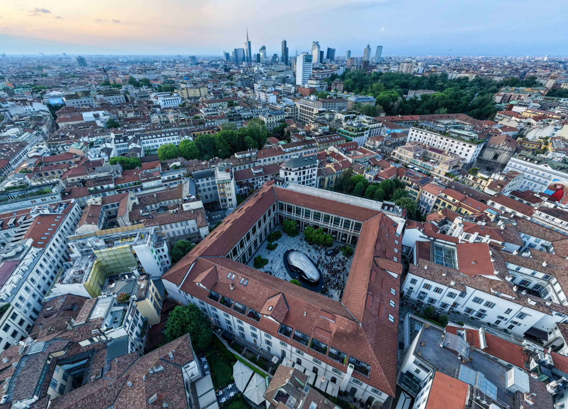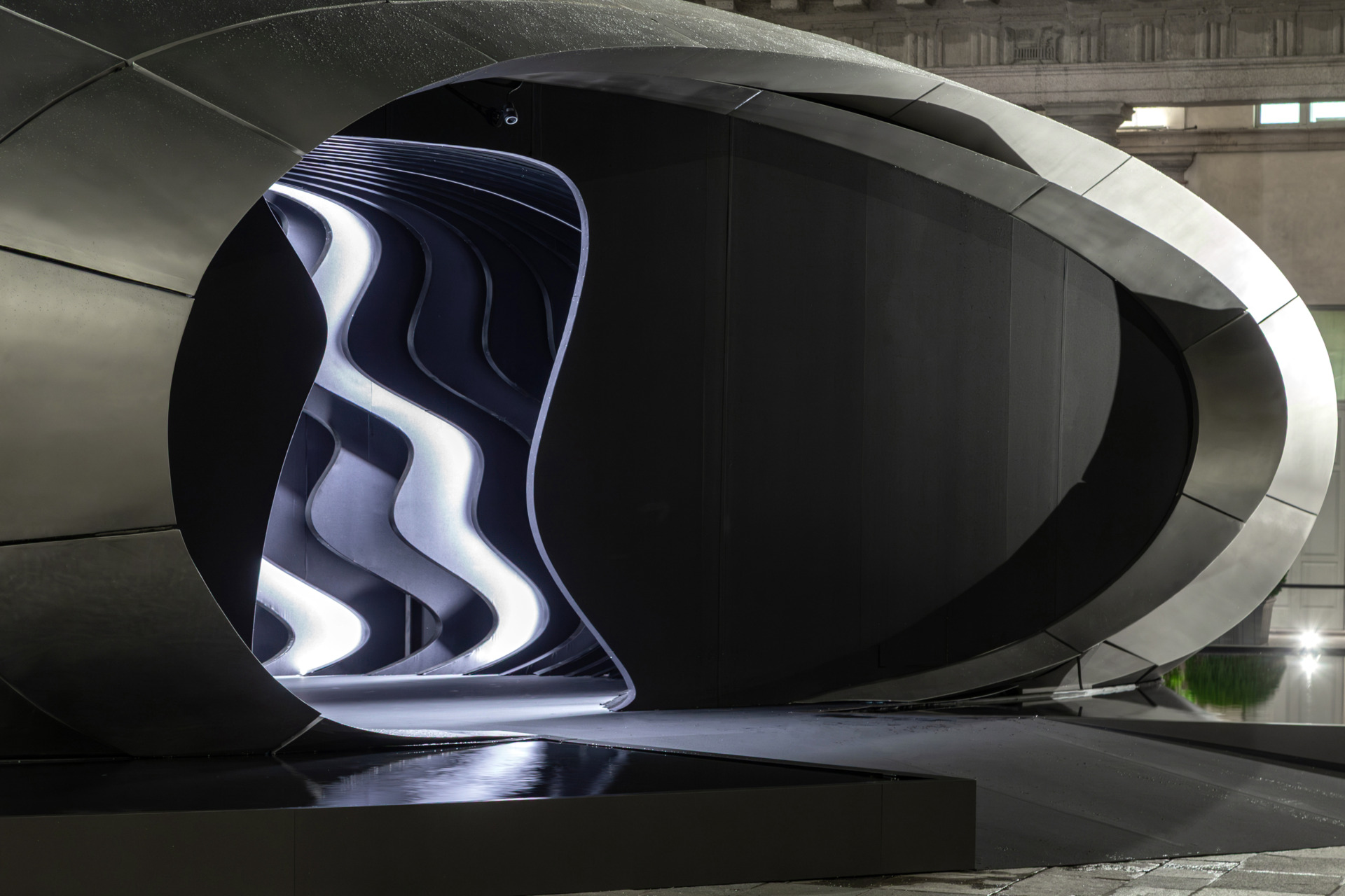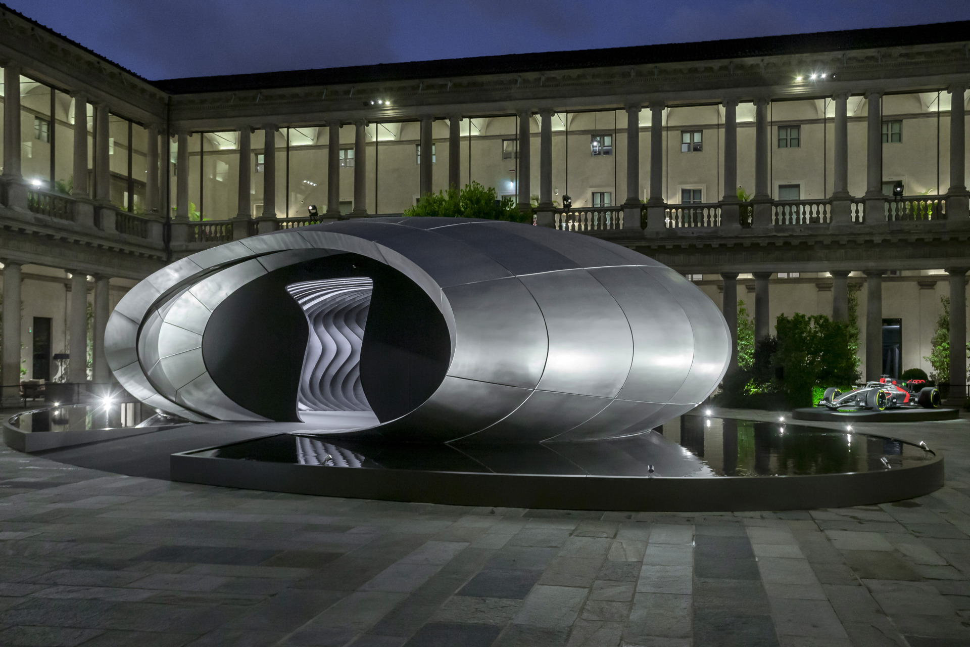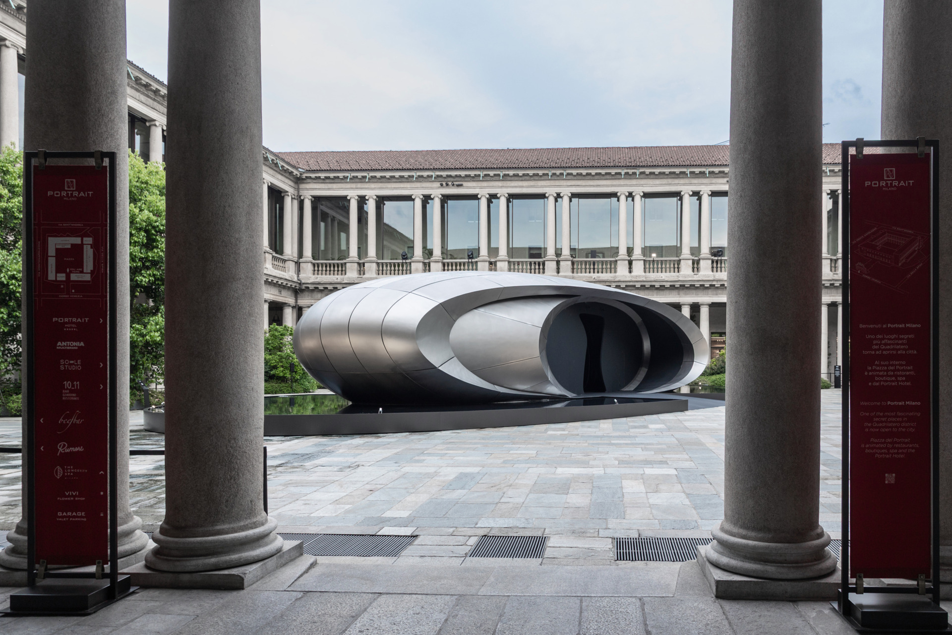 „Origin“ beschränkt sich auf das Wesentliche und lässt das Überflüssige weg. Im Innenhof des ehemaligen Erzbischöflichen Seminars – heute das Hotel Portrait Milano auf dem Corso Venezia – setzt sich das skulpturale Objekt behutsam mit seiner historischen Umgebung auseinander. Die Struktur entwickelt sich kontinuierlich über den gesamten Tag: Wechselnde Spiegelungen und Schatten zeichnen den Raum neu; die Oberflächen enthüllen neue Details, wenn Besucher sich bewegen. Die Architektur selbst wird zu einem beruhigenden Gegenpol zur sinnlichen Intensität der Stadt. Die matte metallische Oberfläche der Installation, die an technische Materialien wie Titan erinnert, absorbiert und reflektiert subtil die chromatischen Töne des Innenhofs. Dies schafft einen Dialog zwischen zeitgenössischem Design und dem vielschichtigen Erbe Mailands. Mehr als ein Objekt ist „Origin“ eine lebendige räumliche Erfahrung – eine Einladung, einzutreten in einen Moment stiller Präsenz im Tempo des modernen Lebens.