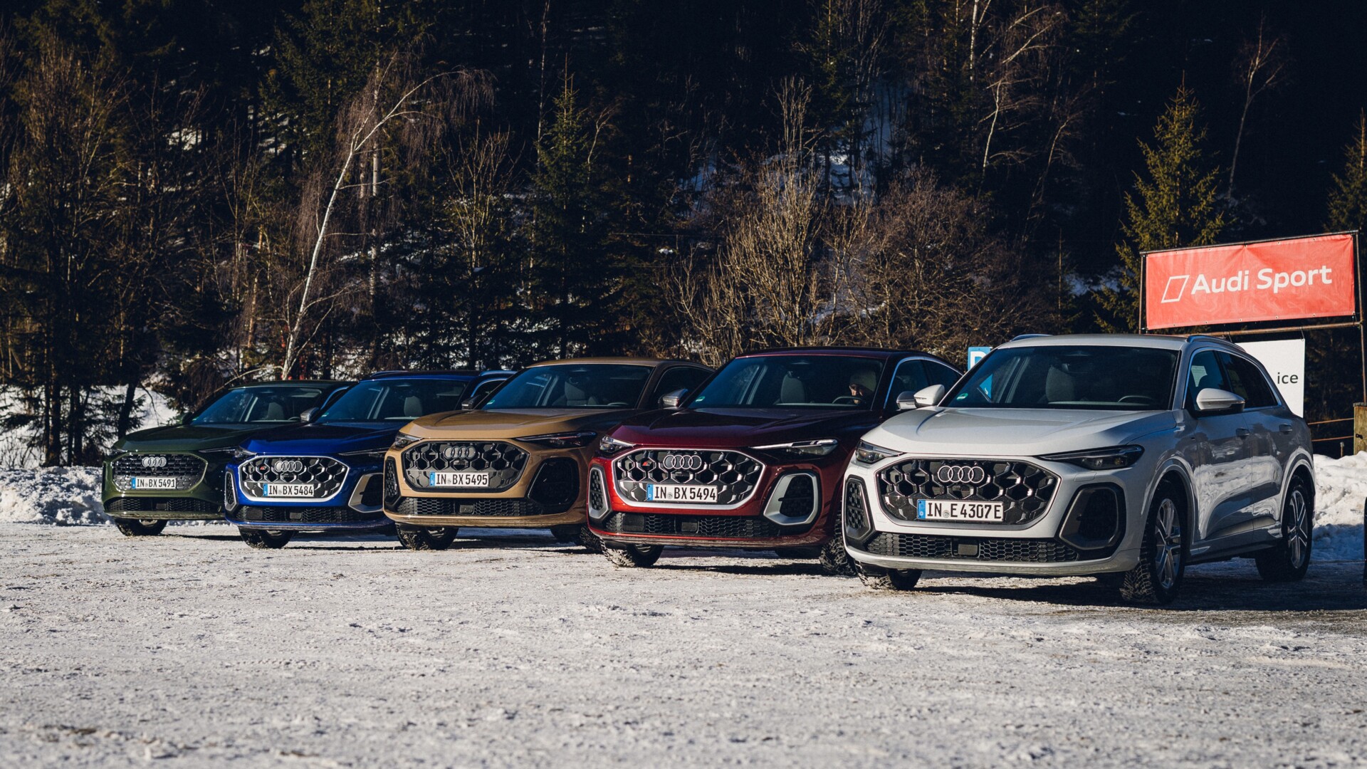 Die automobile Mischung ist bunt. Nicht nur in Hinblick auf die Lackfarben, die von Sakhirgold über Grenadinerot bis Navarrablau allesamt herrliche Kontraste zum verschneiten Hintergrund darstellen, sondern auch sonst: SUV und Sportback sind vertreten, souveräne TDIs ebenso wie effiziente TFSIs und sportliche SQ5 mit ihrem emotionalen Biturbo-V6.