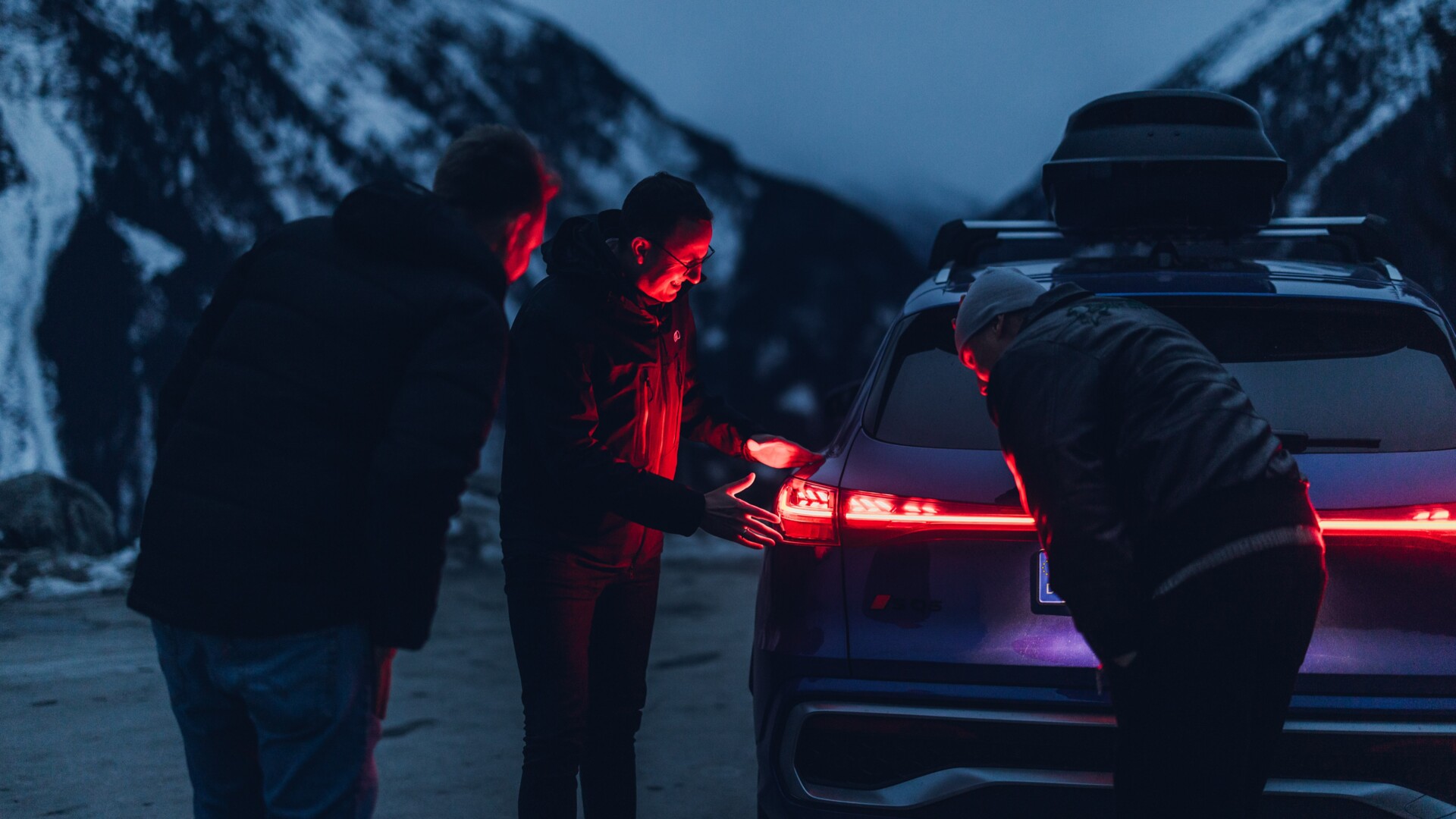 Die anbrechende Dunkelheit nutzt die Gruppe, um die digitalen OLED-Heckleuchten der zweiten Generation in Augenschein zu nehmen. Die Technologie ermöglicht das Kommunikationslicht, das einen wichtigen Beitrag zur Verkehrssicherheit leistet. Gleichzeitig verleihen die digitalen Lichtsignaturen der Q5-Familie bei Nacht einen besonders sportlichen Charakter.
