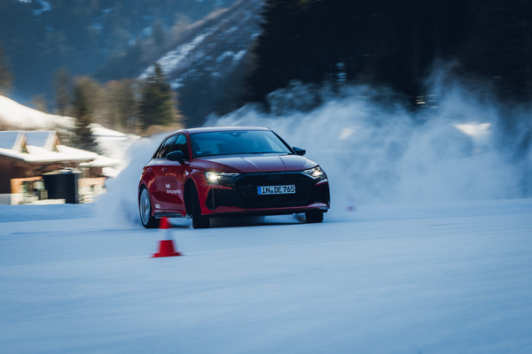 Kurz vor dem eigentlichen Ziel der Reise wartet – sozusagen zum nachhaltigen Aufwärmen – noch ein Adrenalinschub in der Nähe von Saalbach: Die Audi Driving Experience, bei der auf blankem Eis der Tanz im Grenzbereich mit dem RS 3 verfeinert werden kann. Wenig überraschend auch für die Gruppe an Q5-Fahrern ein echtes Highlight; wie auch schon letztes Jahr für eine Gruppe österreichischer Journalisten, die im Februar 2025 just auf dieser Eisfläche nicht nur in den selben Genuss gekommen sind, sondern zudem den fulminanten Audi S1 RS von Reini Sampl live erleben konnten.