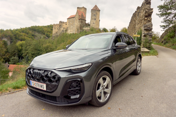 Die enge Bergstraße nach Hardegg ist der ideale Spielplatz für den Q5, eine Kurve reiht sich an die nächste. Kaum Seitenneigung beeinträchtigt das Spiel, scharfes Anbremsen der Kehren mit standfesten und angenehm zu dosierenden Bremsen, unterstützt durch die manuellen Schaltvorgänge der Paddles, die den Takt vorgeben. Präzises Einlenken mit der vorgespannten Lenkung, freigeben und den Druck des Turbodiesels spüren, der die 400 Nm auf die Kurbelwelle stemmt. 7,4 Sekunden auf Hundert km/h sind eine Ansage, der Topspeed von 226 km/h ein Handschlag!