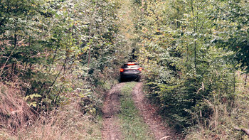 Eng und nass windet sich der Weg von Autendorf hinunter nach Unterthürnau. Dem Audi Q5 kommen seine kompakten Ausmaße zugute, der Offroad-Modus wird zum Muss und wir arbeiten uns durch dichten Wald, Matsch sowie tiefe Spurrillen, die Traktoren in den Weg gezogen haben. Ein Glück, dass die Karosserie mit dem Luftfederfahrwerk um 30-45mm angehoben werden kann.