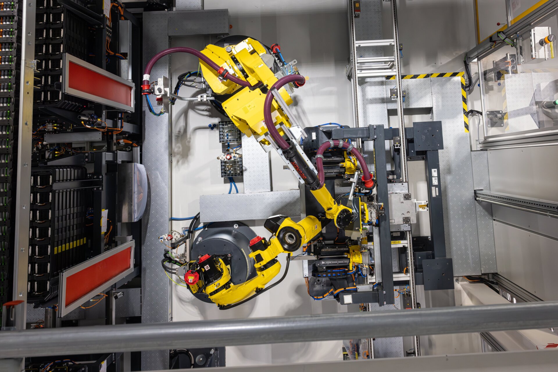 - Einsetzen der Zellträger und Vorbereitung der Zellfahnen: Die Zellstapel werden in die jeweiligen Zellträger eingesetzt. Anschließend werden die Zellfahnen für den Schweißprozess positioniert und vorbereitet.