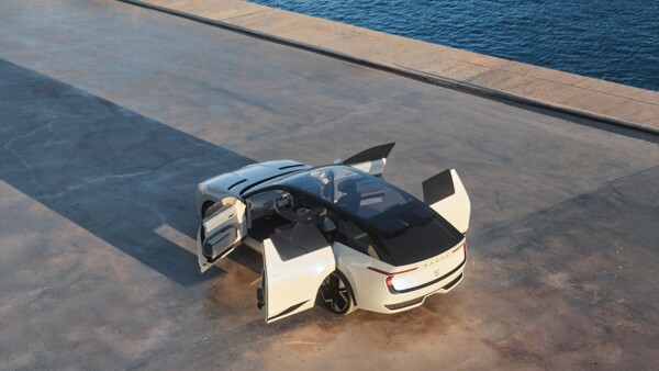In der warmen Nachmittagssonne sieht die Vision O atemberaubend aus. Das natürliche Licht unterstreicht die eleganten Proportionen des Autos und die luftige Atmosphäre des Innenraums.