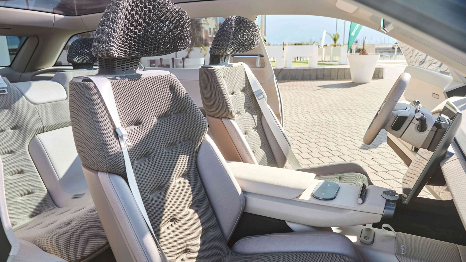 Im geräumigen Innenraum betont das Tageslicht die unkonventionellen, aus Ultrasint TPU gefertigten Kopfstützen. Ultrasint TPU ist ein innovatives Recyclingmaterial, bei dessen Herstellung kein Abfall entsteht. Innovativ ist auch die neue Benutzeroberfläche mit einem horizontalen Display, das sich entlang der Unterkante der Windschutzscheibe erstreckt.