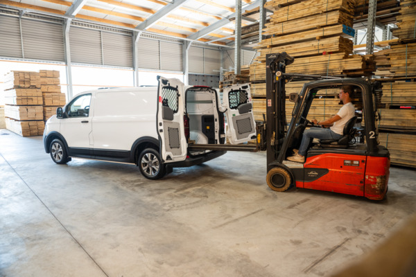 Besonders praktisch für Handwerker: Der Transporter kann mit 230 Volt Steckdosen im Laderaum ausgerüstet werden, die Elektrogeräte mit 400 Watt (Diesel) oder 2.300 Watt (e-Transporter) versorgen. Der Transporter wird damit zum fahrenden Stromlieferanten für Ladegeräte genauso wie für Standkreissägen.